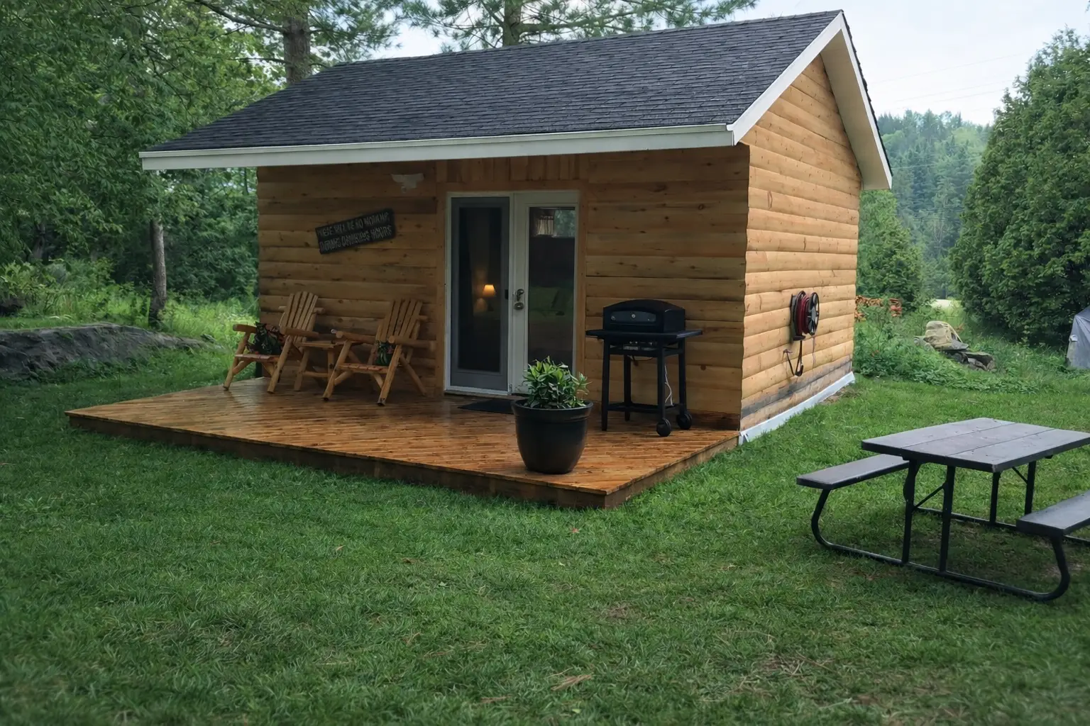 Experience comfort and convenience in Room Two, featuring a covered veranda and two luxurious pillow-top single beds. The room includes a private 4-piece bathroom, heat/AC, ceiling fan, fireplace and a TV. A mini fridge with a freezer, microwave and coffee maker is also provided for your convenience. Spend some time outdoors and unwind in our picnic area, equipped with a BBQ, fire-pit, and comfortable Muskoka chairs.